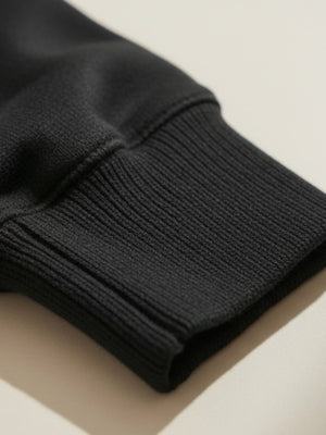 The structured rib-knit cuffs provide a snug yet comfortable fit that holds its shape over time. This subtle detail enhances durability while adding a touch of texture and refinement to the sleeve design.
